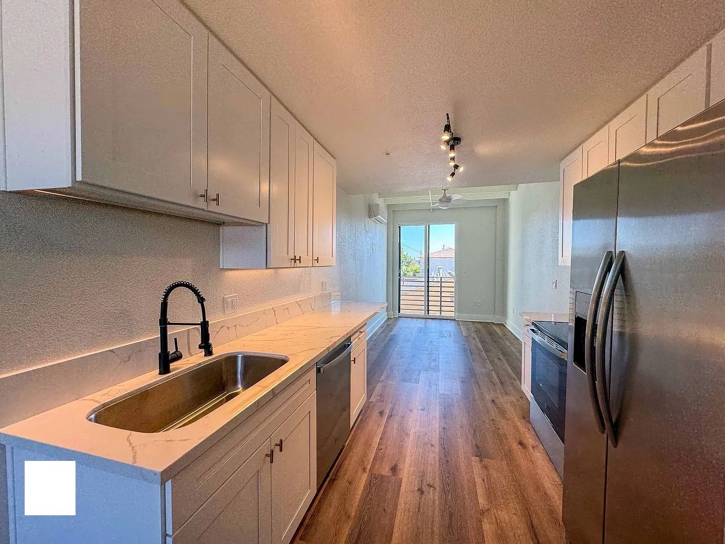New-construction 1‑bed, 1‑bath apartment in San Diego offers modern finishes and thoughtful design. The unit features laminated wood flooring throughout, a designer kitchen with quartz countertops, luxury soft-close cabinets and stainless steel appliances. Comfort is provided by AC mini-splits in both the bedroom and living room, and in-unit washer/dryer adds convenience. Enjoy two private balconies with city views plus a private rooftop deck with views toward Point Loma. Additional highlights include a one-car garage and the building’s close walkability to restaurants and bars, with the beach only minutes away.