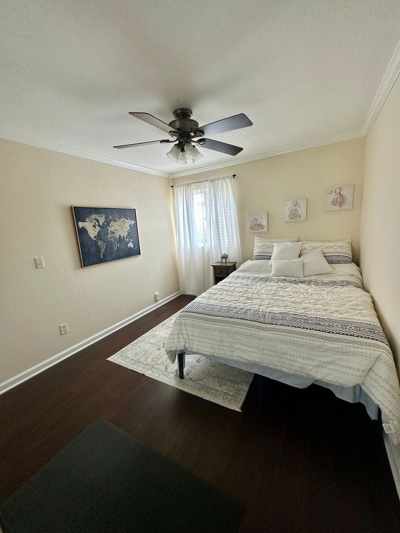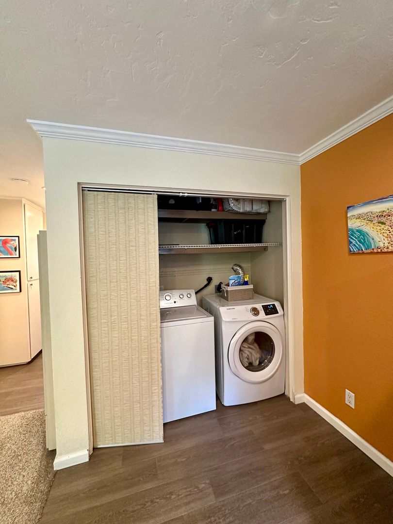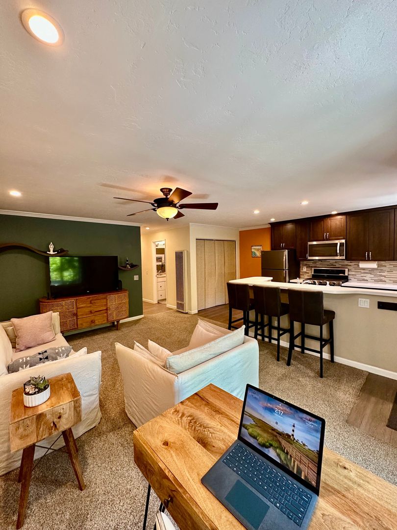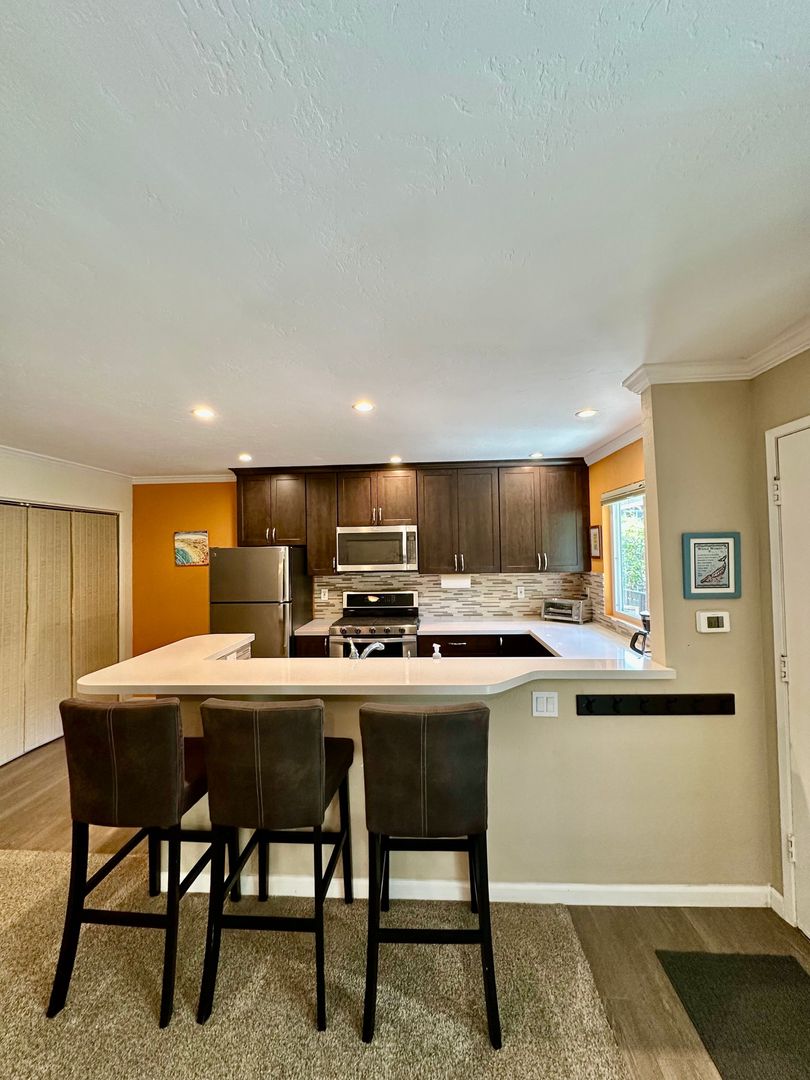 Beautifully maintained 2-bedroom, 1.5-bath condo featuring a large in-unit washer and dryer, dishwasher, and one assigned parking space. All utilities are included with a $200 monthly allowance toward SDGE bill. This comfortable condo features a king bed in the master bedroom and a queen bed in the second bedroom, both with brand-new memory foam mattresses for a great nights sleep.